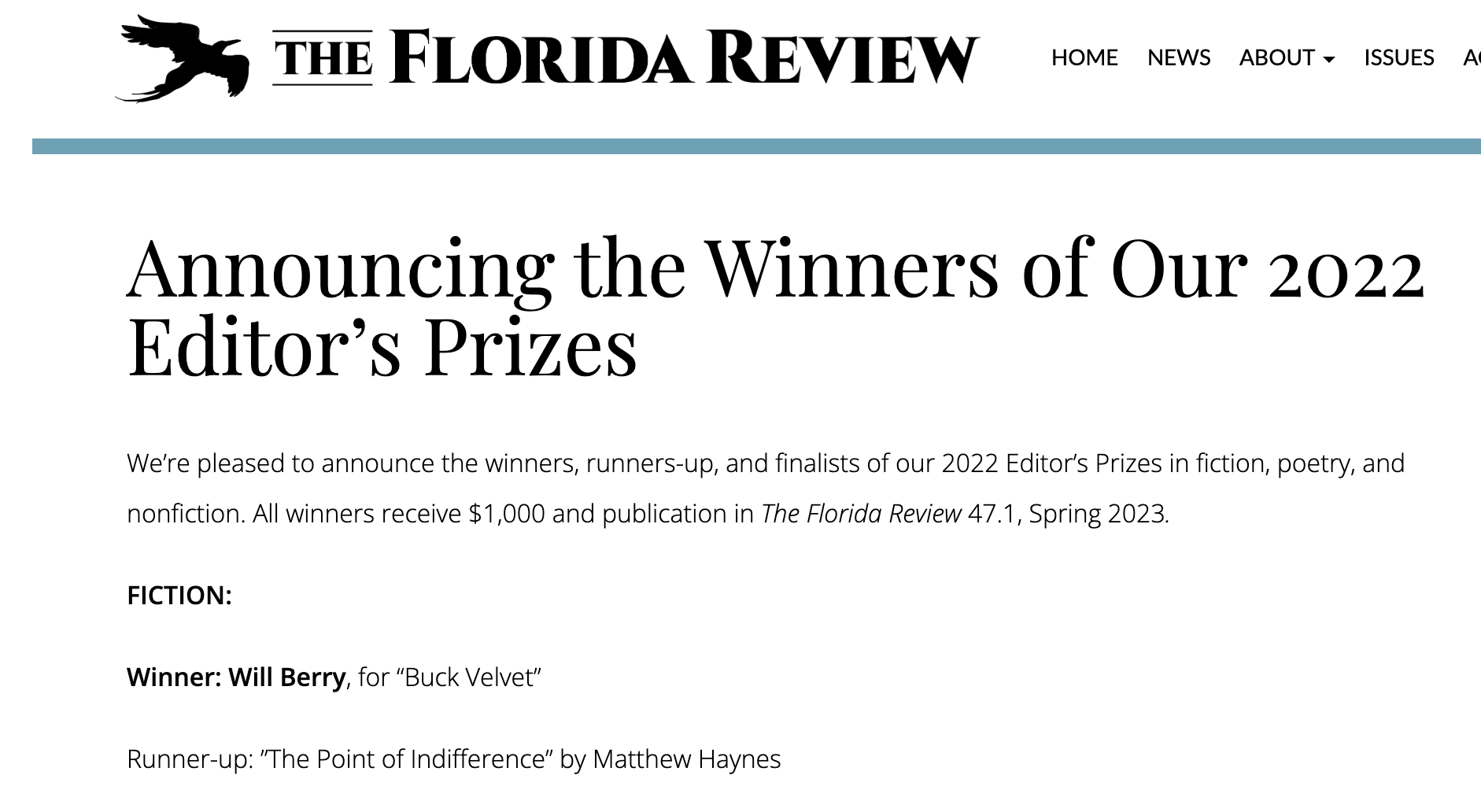 Thanks to The Florida Review for naming me the runner-up for the 2022 Editor’s Prize in Fiction.
